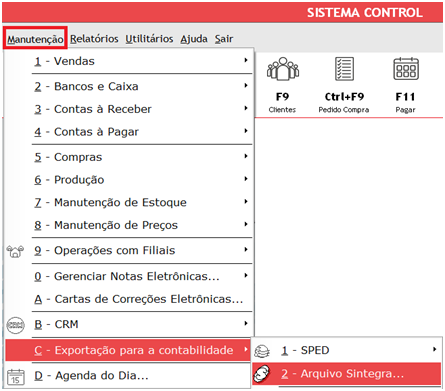 - Manutenção > Exportação para a Contabilidade > Arquivo Sintegra.