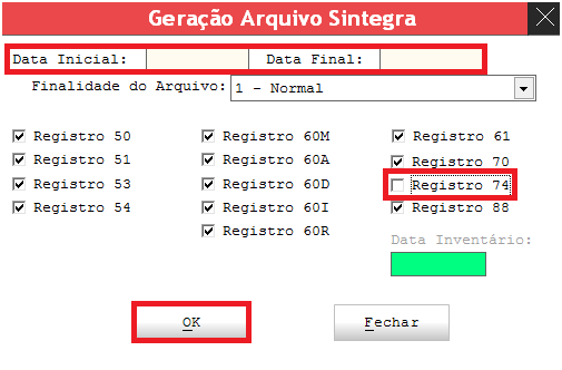 - Desmarcar o Registro 74 (Será gerado somente quando a contabilidade solicitar).