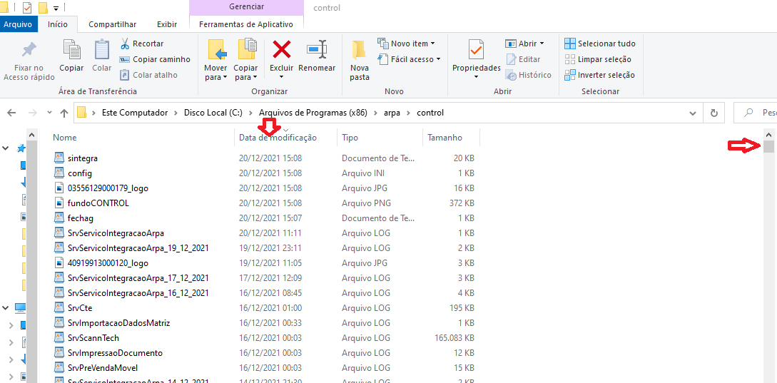 Quando abrir a janela é só clicar em data da modificação para organizar para o ultimo arquivo criado que neste caso é o sintegra e verificar a barra de rolagem para colocar no topo da pagina pra ficar mais fácil a visualização.