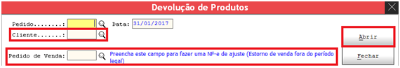 Ao seguir o caminho citado acima, o sistema abre o módulo de devolução. Nessa etapa é necessário teclar Enter para passar o campo do Pedido (o sistema irá gerar automaticamente o número do pedido de estorno). Logo depois, preencher o cabeçalho da devolução informando o Cliente que realizou a compra. Como na realidade essa devolução trata-se de um estorno, faz-se necessário preencher o campo do Pedido de Venda e clicar em Abrir.