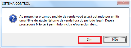 - Ao abrir o pedido, o sistema retornará uma mensagem informando sobre a NF-e de ajuste (estorno), clicar em Sim.