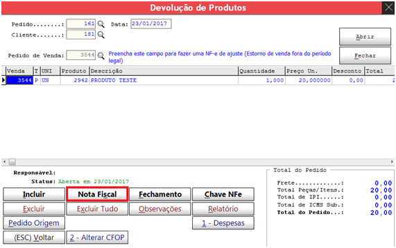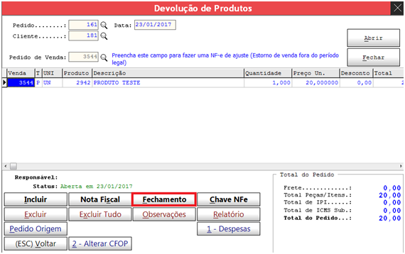 > Após a impressão da nota fiscal de estorno, voltar para a tela de Devolução de Produtos e clicar em Fechamento.