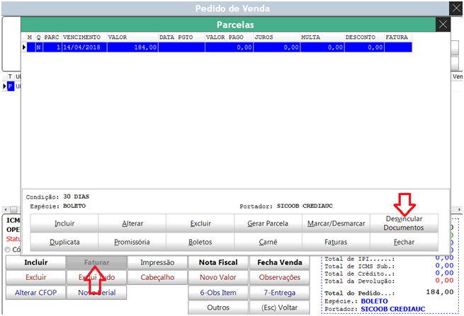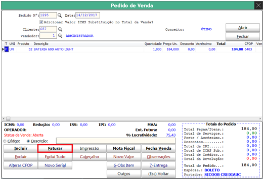 > Para emissão do boleto é necessário faturar o pedido de venda, clicando em Faturar:
