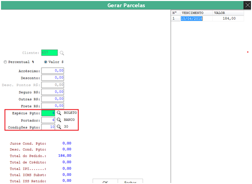 > Informar a forma de pagamento, preenchendo os campos: Espécie Pgto, Portador e Condições Pgto: