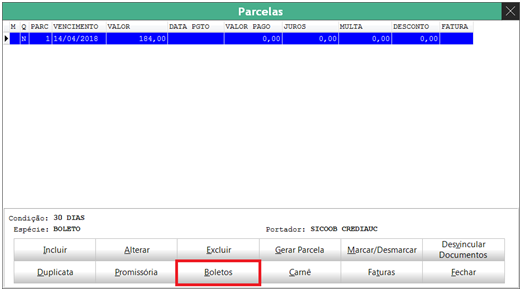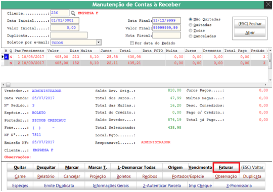 - Logo após apagar o número da Duplicata, conforme explicado anteriormente, clicar em Faturar, informar a nova forma de pagamento e gerar novos boletos.