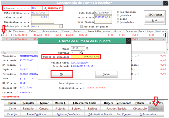 - Abrir o Contas à Receber do cliente > Marcar a parcela que irá ter o vencimento alterado ou a parcela que será refaturada e que foi gerado boleto > Clicar em Duplicata > Apagar o Número da Duplicata > OK:
