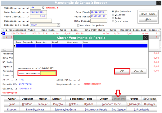 - Logo após apagar o número da Duplicata, conforme explicação acima, clicar em Vencimento > Informar o Novo Vencimento > Clicar em OK: