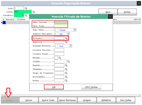 - Clicar em Incluir > Informar Data Inicial e Data Final (período em que foram gerados os boletos para emissão) e o Portador (banco pelo qual foram gerados os boletos) > Clicar em OK: