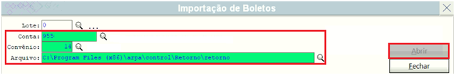 - Informar a Conta e o Convênio > Indicar o local onde o arquivo foi salvo > Clicar em Abrir: