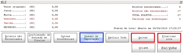 > Clicar em Quitar (para quitar as parcelas que constam no arquivo de retorno) e depois, clicar em Finalizar Lote: