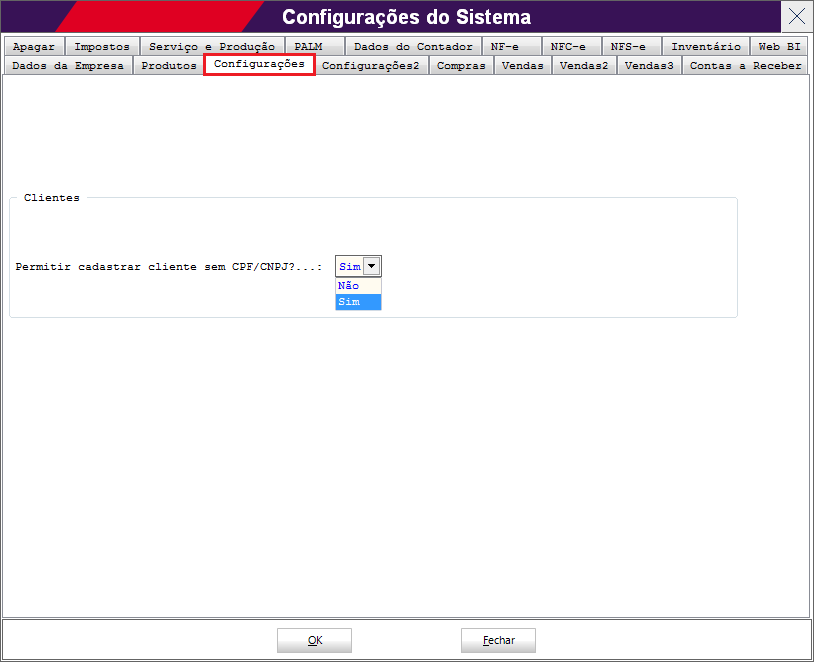 Ao seguir o caminho citado acima o sistema irá abrir a janela de configuração, nessa janela vamos até o guia 'Configurações' marcando Sim na opção Permitir cadastrar clientes sem CPF/CNPJ, feito isso, salve pelo botão OK.