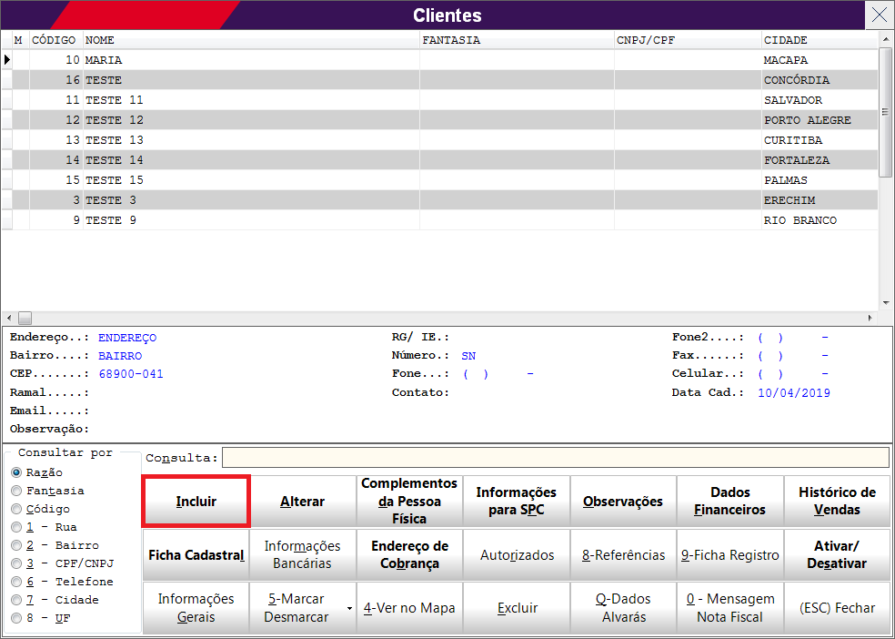 Feito a configuração, será necessário acessar o cadastro, o cadastro poderá ser acessado através do comando rápido F9, ou então pelo menu Cadastros>Clientes>Clientes, e em seguida na opção "Incluir":