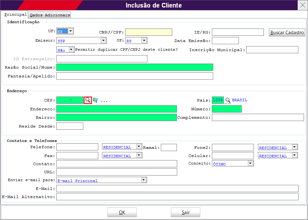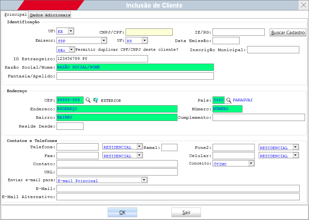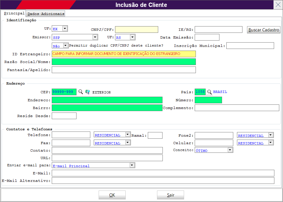 Feito isso, inclua esse CEP no cadastro do cliente. Ao incluir o CEP e passar com enter, se abrirá um novo campo, e o foco de digitação ficará em cima do campo "ID do estrangeiro", o operador deverá colocar as informações nesse campo, que basicamente trata-se de um código de identificação do estrangeiro. Normalmente ele não é um campo liberado no cadastro de Clientes, só é habilitado caso os campos de UF fique como EX e o CEP seja 99999-999. O campo ID Estrangeiro pode ser alfanumérico, ou seja, comporta letras como numerais, assim, o campo pode ser preenchido com qualquer documento do estrangeiro como por exemplo o passaporte.