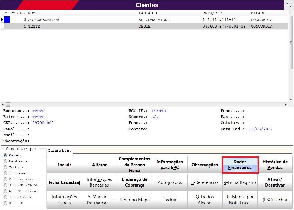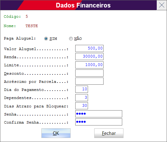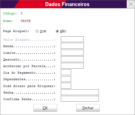 Nessa janela o sistema traz o código e o nome do cliente, e os próximos campos são destinados as informações referentes aos dados financeiros do cliente.