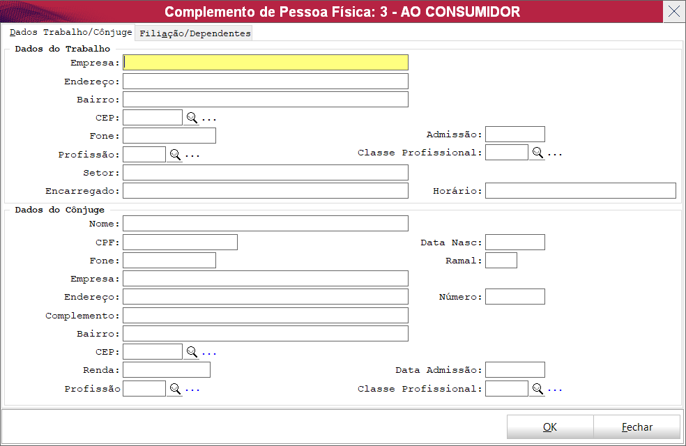 Essa janela disponibiliza ao usuário duas abas, na primeira conforme exemplificado acima o usuário pode preencher dados referente ao cônjuge e dados referente ao trabalho.
