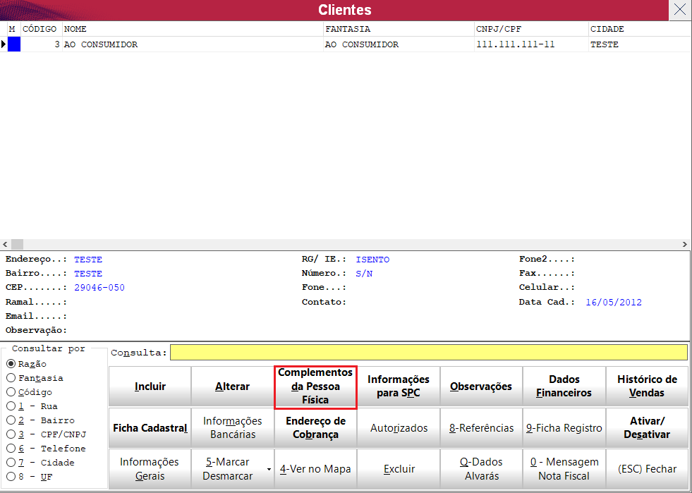 Ao seguir o caminho citado acima o sistema irá abrir a seguinte janela, selecione o cliente que deseja vincular as informações e pressione o botão Complementos da Pessoa Física. Segue exemplo.