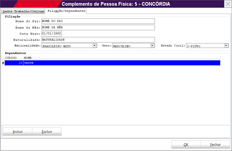 Já na segunda aba podem ser preenchidos dados referente filiação e dependentes, conforme exemplificado na imagem abaixo:
