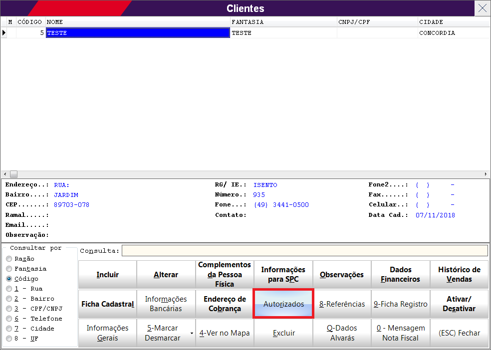 Nessa mesma janela de cadastro de clientes, o sistema trás para o usuário o botão Autorizados, conforme mostra o exemplo abaixo: