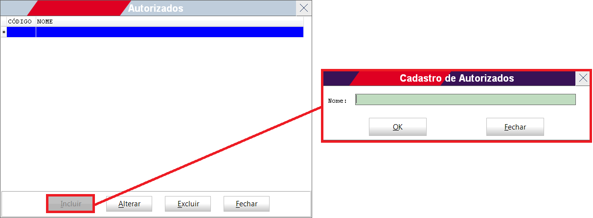 Em seguida o sistema irá abrir a seguinte janela, nela, pressione o botão Incluir. Após pressionar o botão Incluir o sistema irá abrir a janela abaixo, então digite o nome do autorizado e pressionar o botão Ok.