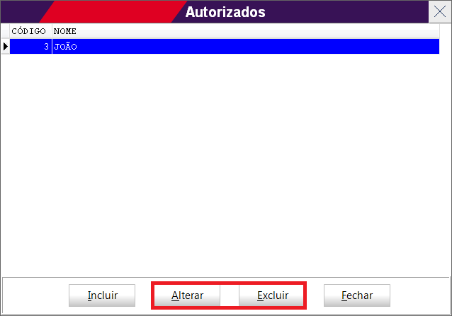 Nessa mesma janela é também possível alterar e excluir autorizados: