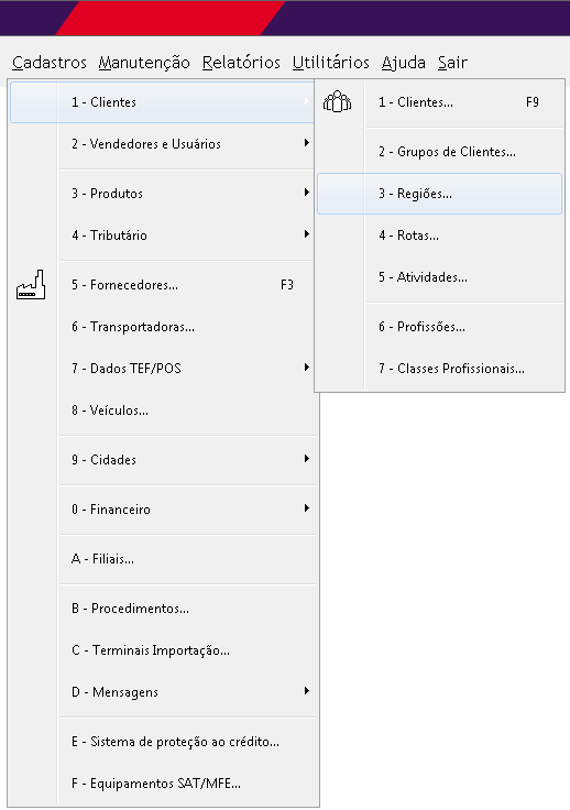 Para fazer o cadastro de uma nova região no sistema control, clique no menu Cadastro > 1. Clientes > 3. Regiões. Segue o exemplo do caminho que deve ser seguido para abrir a janela de cadastro de regiões.