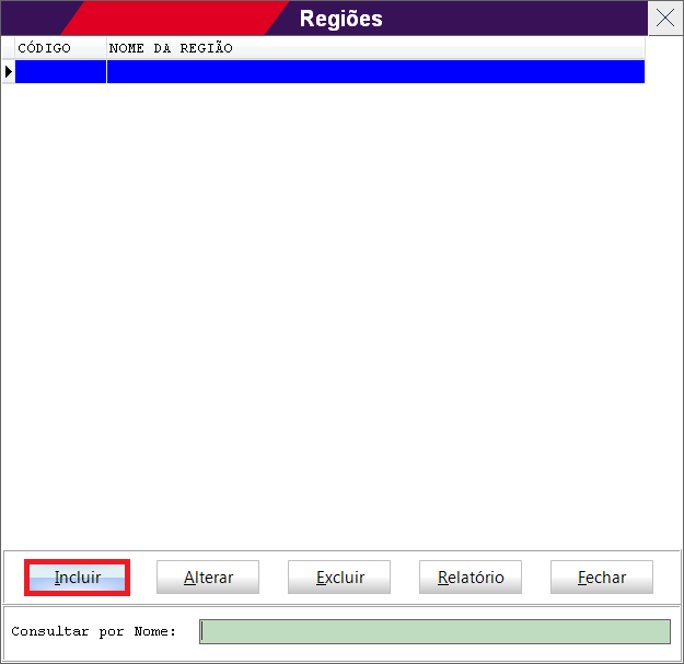 Depois de seguir o caminho citado, o sistema irá abrir a seguinte janela, nela, clique no botão Incluir para efetuar o cadastro de uma nova região. Segue o exemplo.