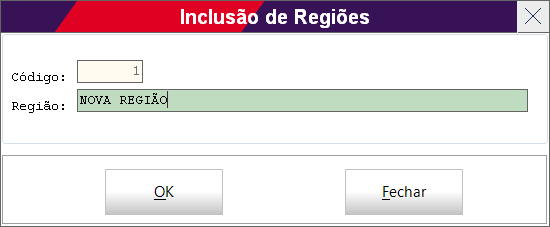 Abaixo segue um exemplo de cadastro, neste caso é preciso informar somente a descrição da região, pode ser utilizado o termo desejado para facilitar a identificação na hora de vincular a região ao cliente, o código não pode ser incluído nem alterado, pois esse, o sistema irá trazer automático, seguindo sempre uma sequência, fazendo isso é só pressionar o botão OK que o sistema irá salvar as informações gravadas no novo cadastro.