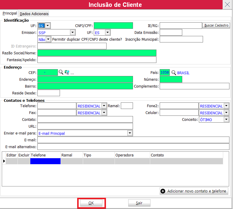 após clicar em incluir abre a tela para poder lançar os dados da empresa, apenas os campos em verde são obrigatórios