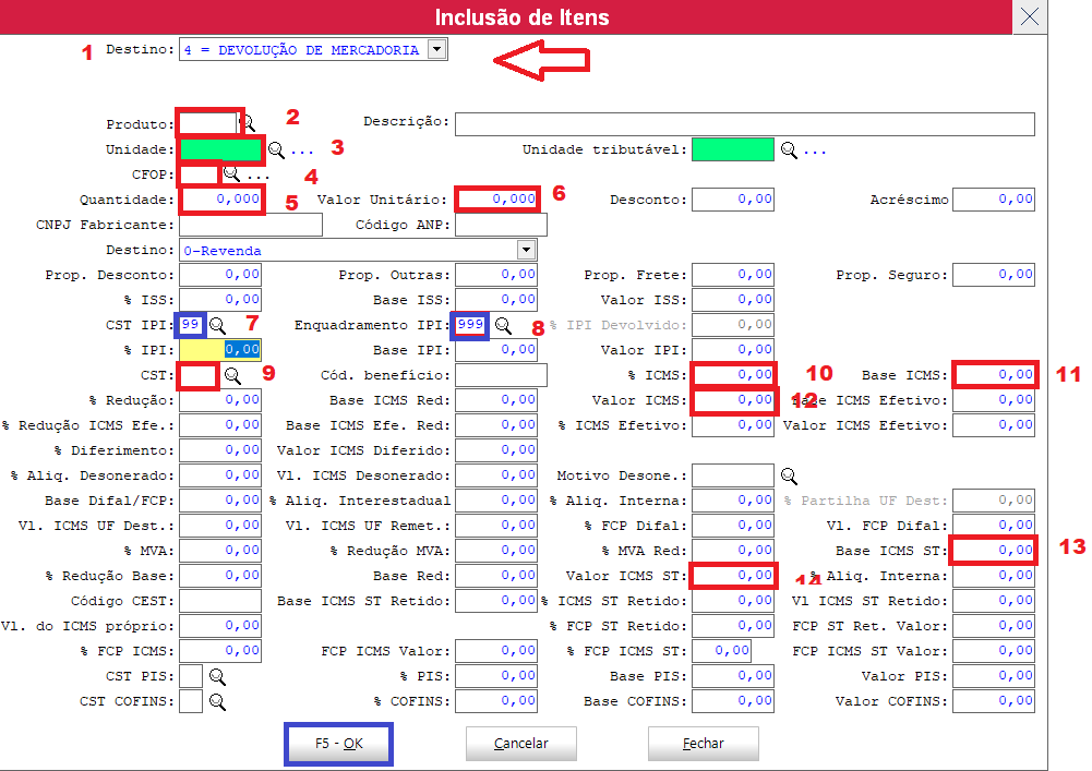 depois de preencher os campo é só ir apertando ENTER para ir pulando os campos até chegar no OK para finalizar o lançamento do item, se houver mais itens é só repetir o processo. Mas se não houver mais itens para lançar pode clicar em fechar a tela de lançamento de itens.