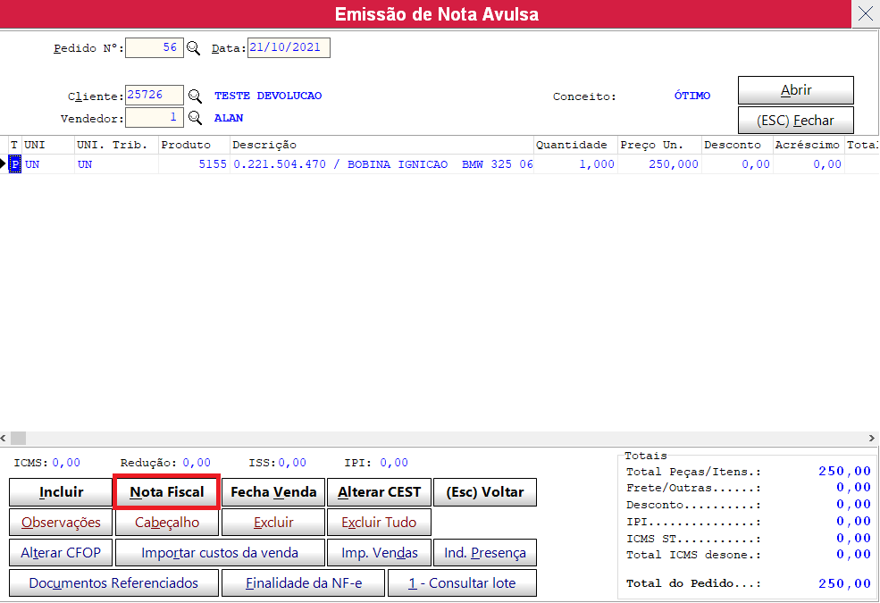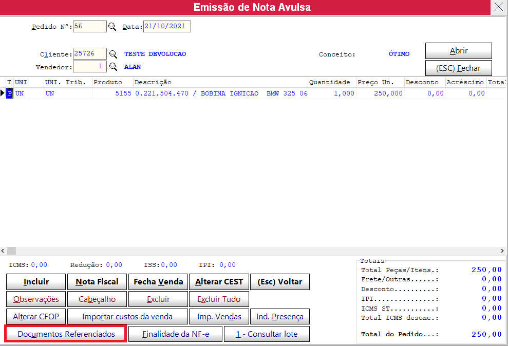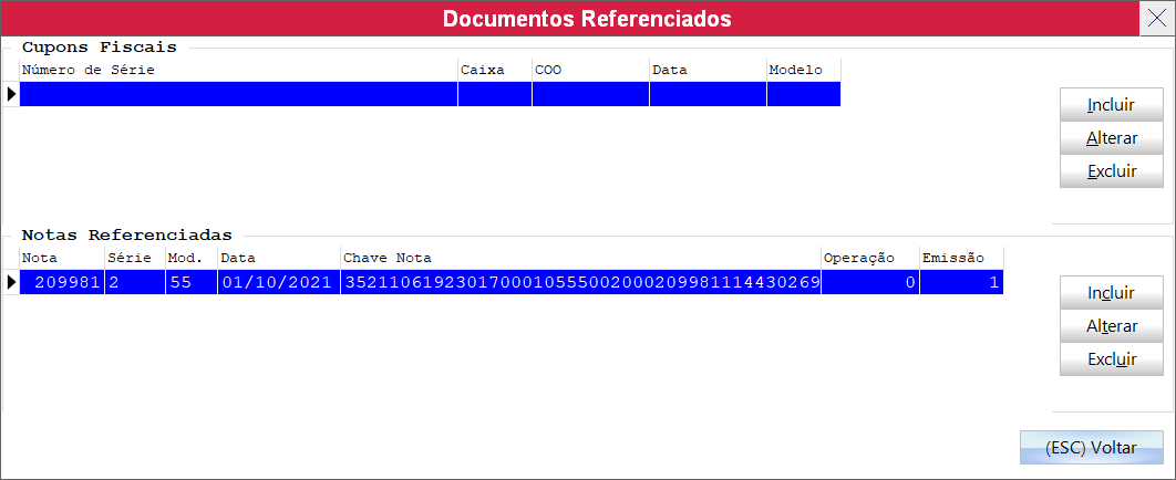 Tecla ESC para voltar ou clicar no botão voltar para fechar a tela de documentos referenciados que irá voltar para tela principal para clicarmos em NOTA FISCAL