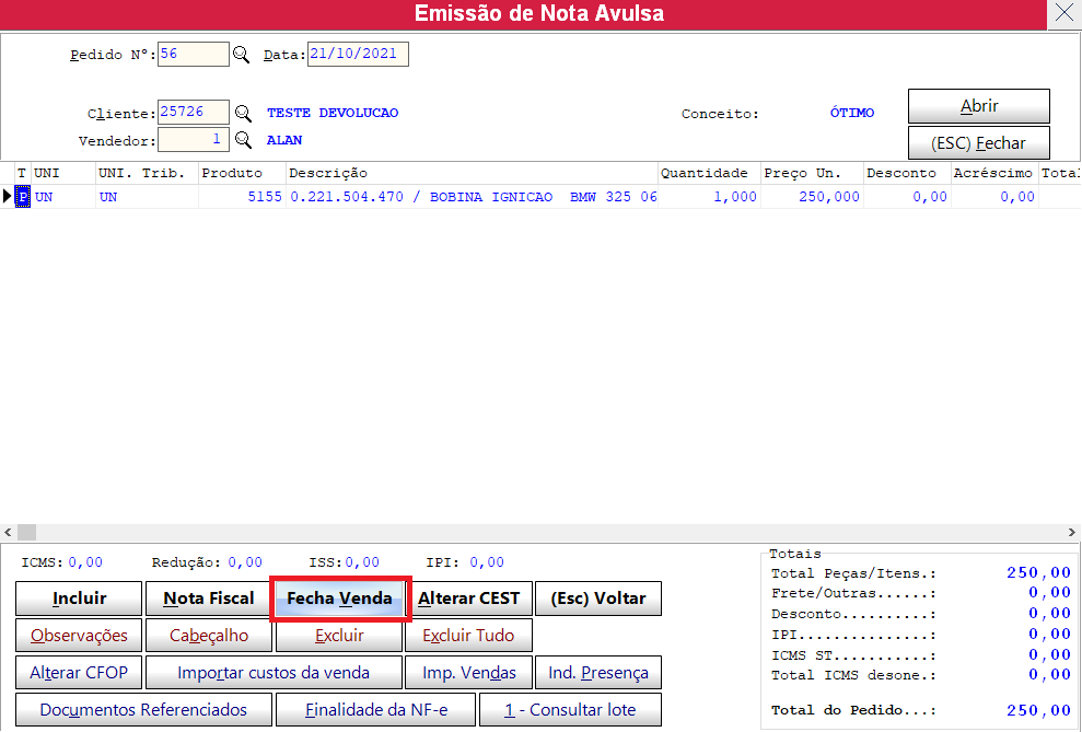 Após imprimir e fechar a tela de visualização volta para tela principal de deverá ser finalizada apertando o botão FECHAR