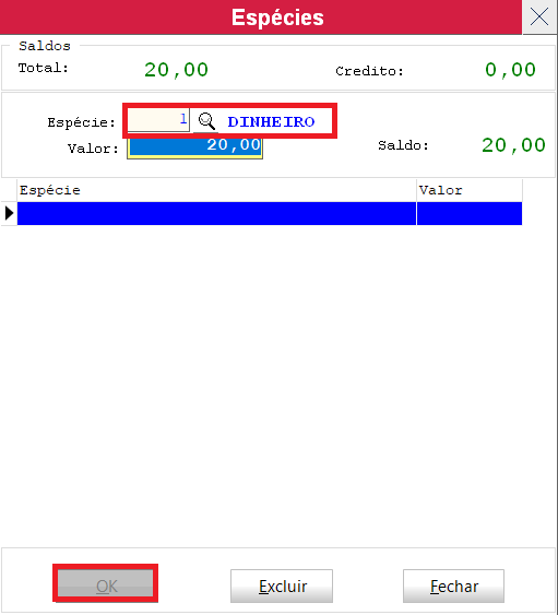 após clicar no botão OK abrirá a seguinte tela para escolher a espécie utilizado no pagamento.
