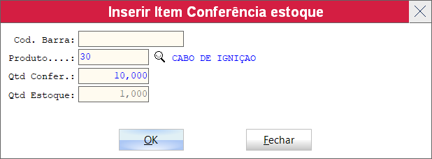 Depois de clicar em incluir abrira a seguinte tela para colocar o código do produto e colocar a quantidade encontrada na contagem do estoque, neste exemplo o estoque terá 10 peças.