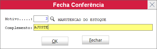 vai abrir esta janela para colocar o motivo e complemento, depois clica em OK e a conferencia com ajuste do estoque foi finalizada.
