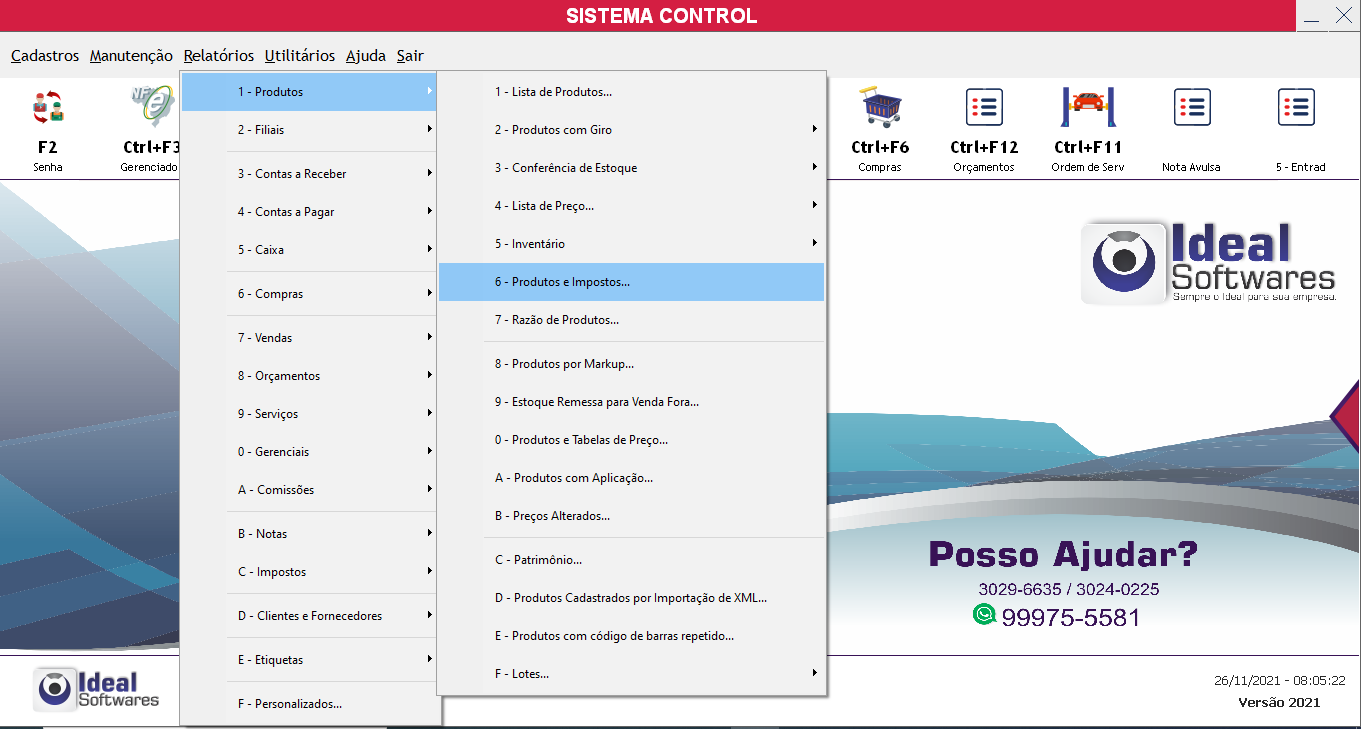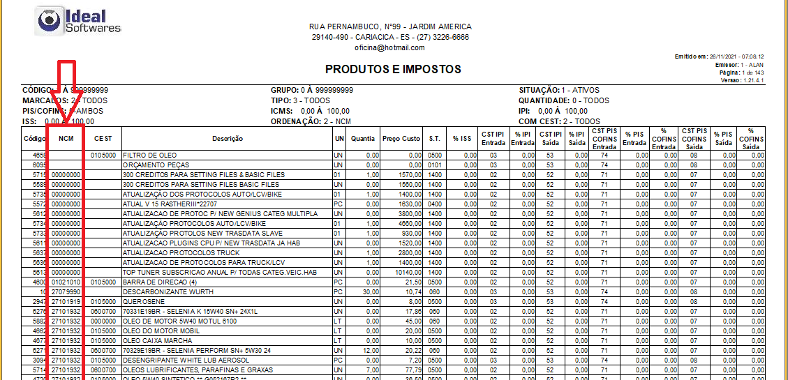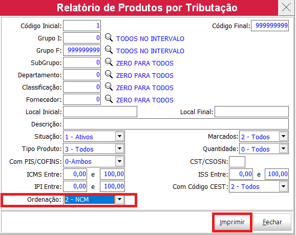 Neste relatório é possível agrupar e extrair aparte dos produtos do estoque ou todos, neste exemplo iremos ver como extrair todos os produtos e ordenar por NCM.