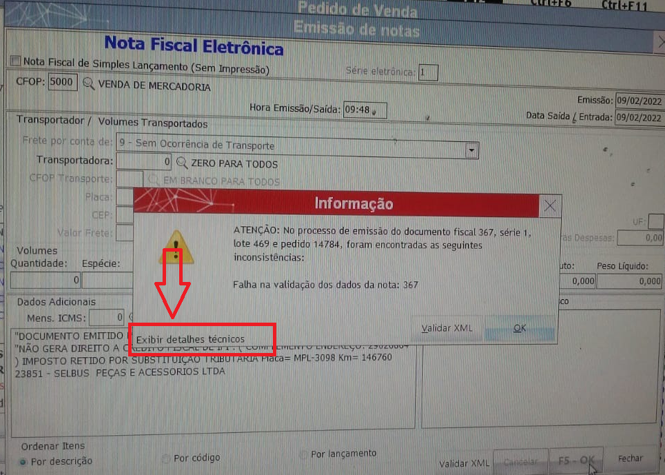 Em alguns casos a nota não é aprovada e aparece esta tela de mensagem, clica em exibir detalhes técnicos para exibir qual o motivo da nota não ser aprovada.