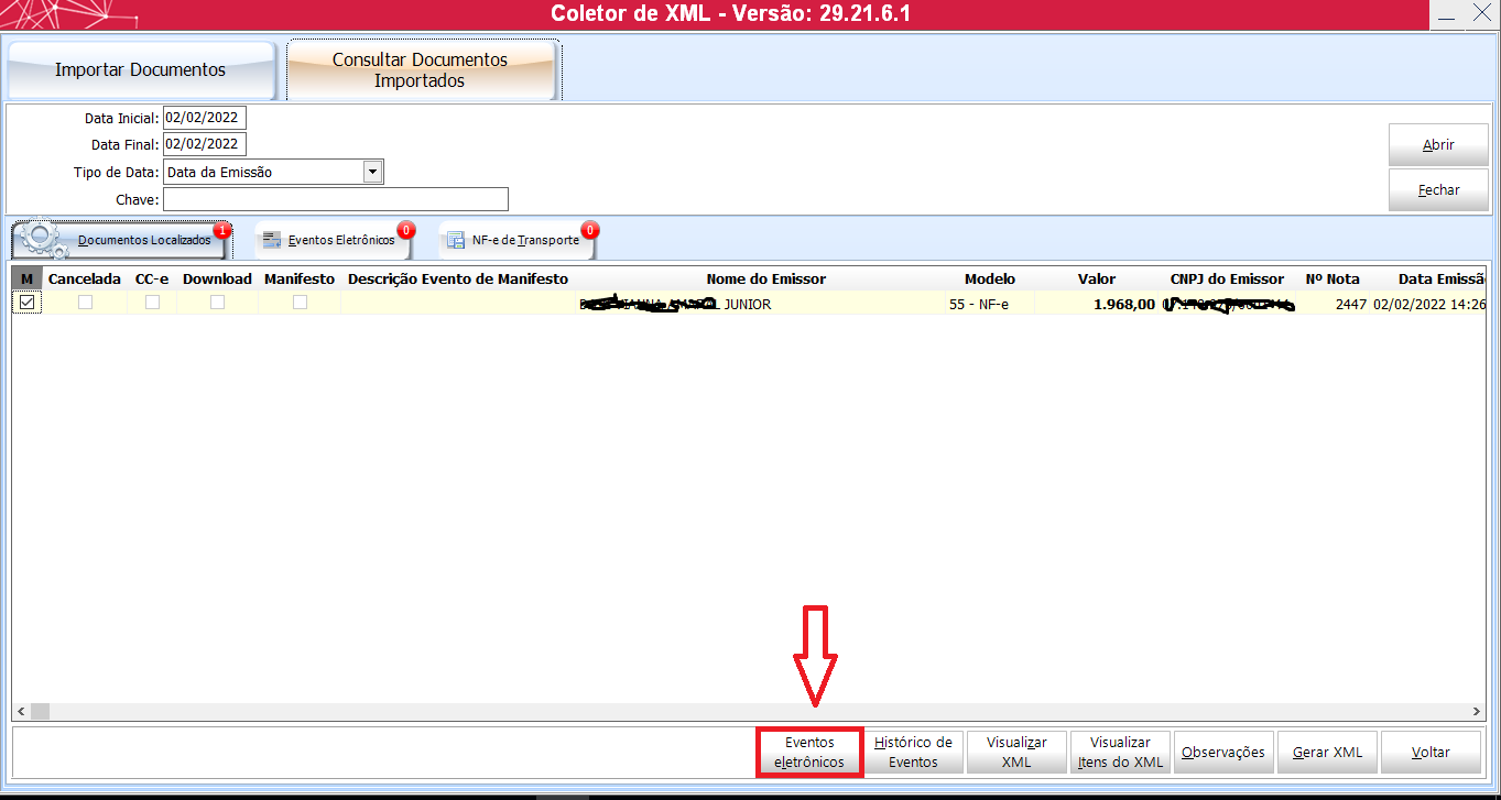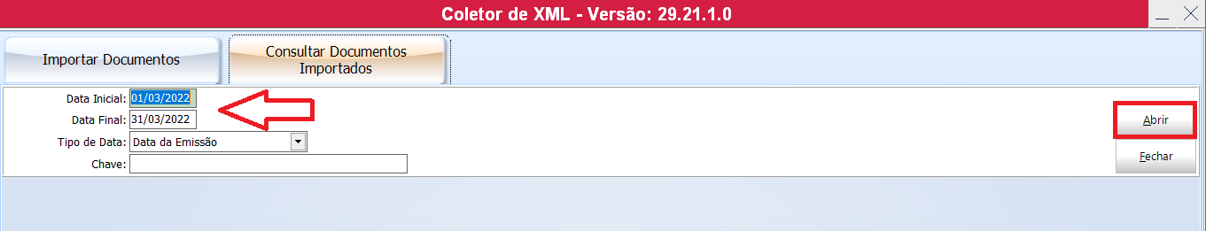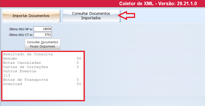 4º O sistema irá buscar os XMLs e apresentará o resumo da consulta, depois clica em CONSULTAR DOCUMENTOS IMPORTADOS.