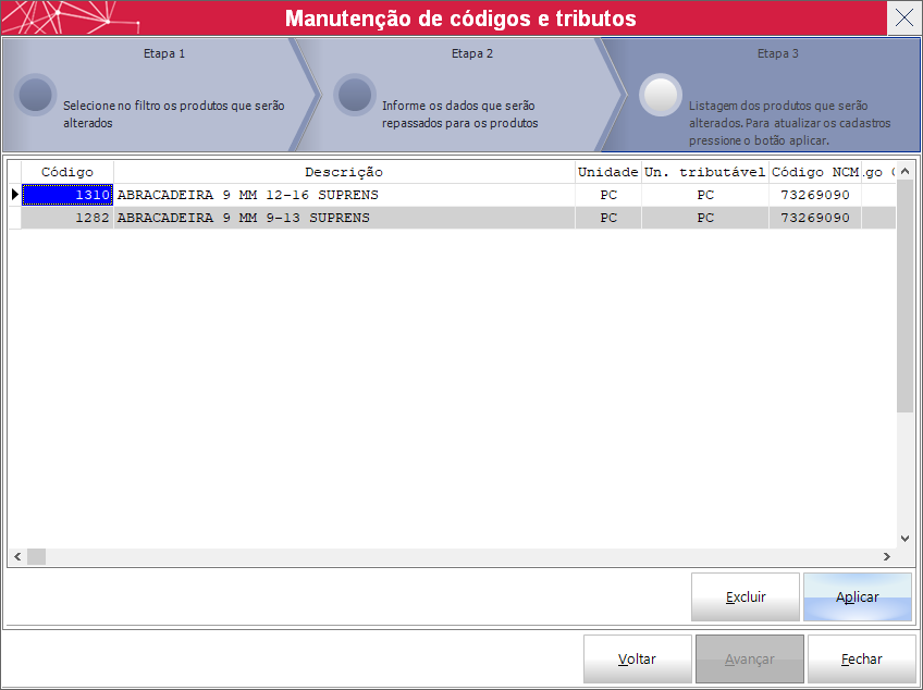 após inserir as informações que deseja alterar e clicar em avançar, irá aparecer a tela a baixo para clicar em aplicar e atualizar o estoque.