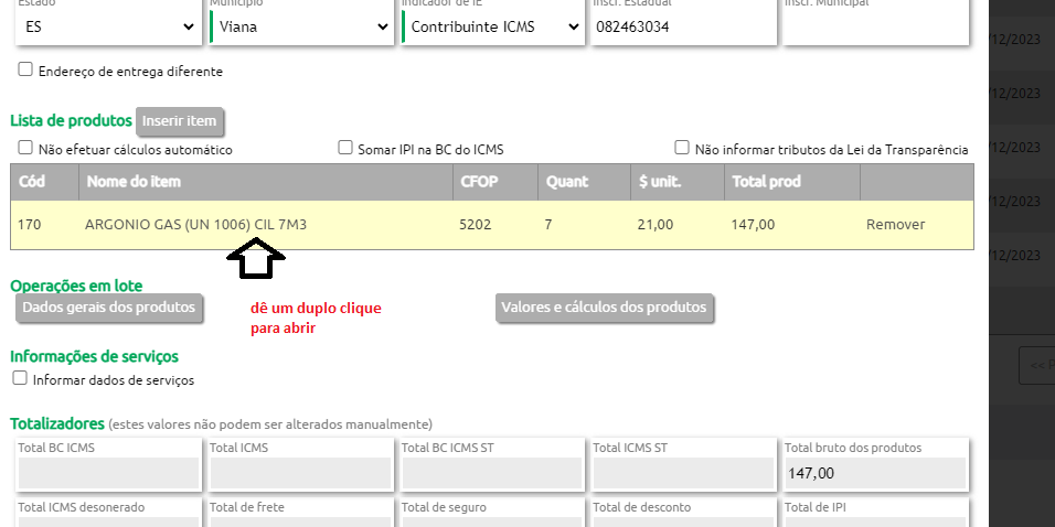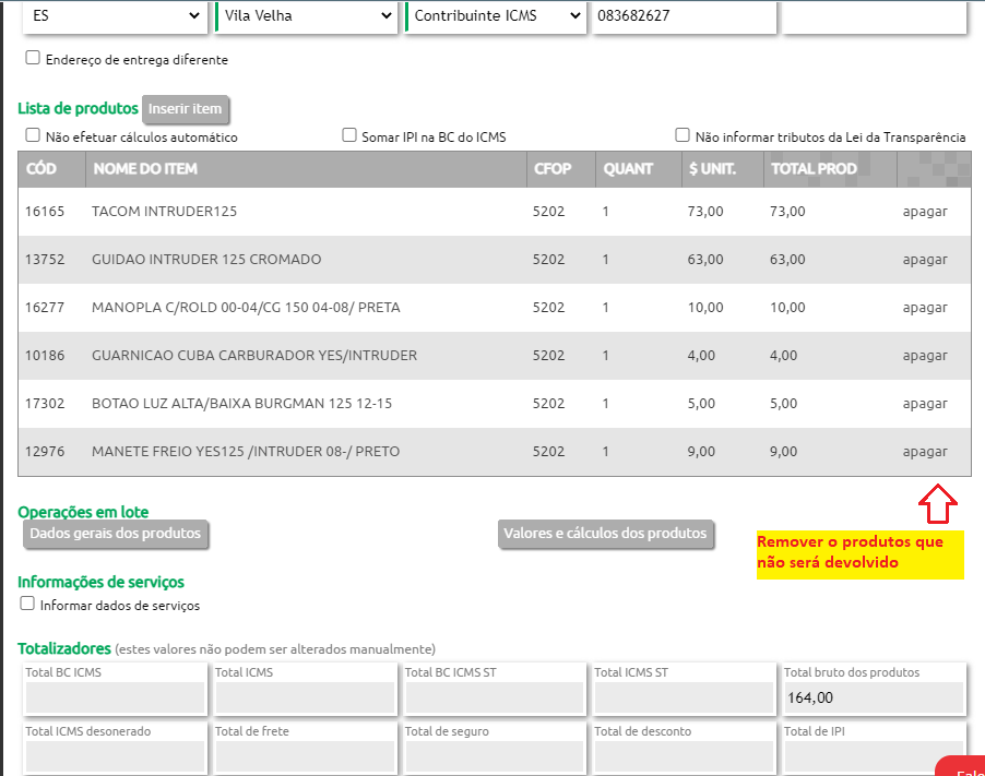 Após remover os produtos que não serão devolvidos, dê um duplo clique sobre o produtos que será devolvido conforme imagem a seguir.