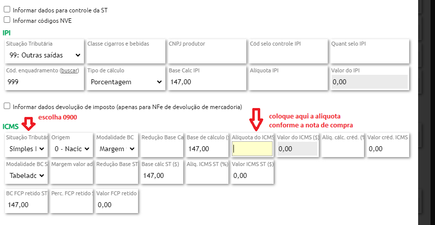 ao abri a janela de dados de importos do prdutos concidere a situação tributária, base de calculo e aliquota de icms que deverá apresentar o valor de ICMS igualmente ao da nota de compra. Neste exemplo a empresa é do simples nacional e portanto usará na situação tributária 0900.