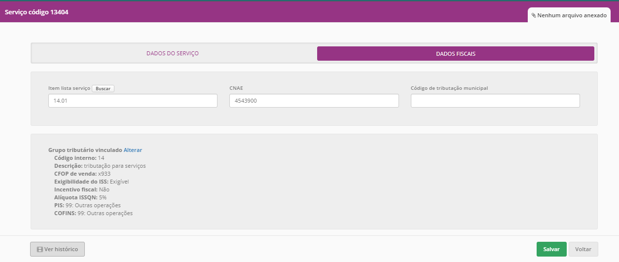 Este erro acontece por faltar informações fiscais no cadastro do serviço para poder emitir nota fiscal.