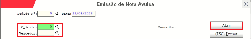 > Informar Cliente (quem deve aparecer no campo Destinatário da nota) e Vendedor > Clicar em Abrir: