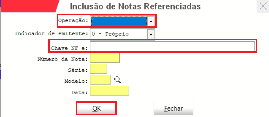 > Informe a Operação da nota que está sendo referenciada (Entrada ou Saída) e a Chave NF-e (chave de acesso da nota). Após informar a chave, aperte ENTER que os campos em amarelo serão preenchidos automaticamente: