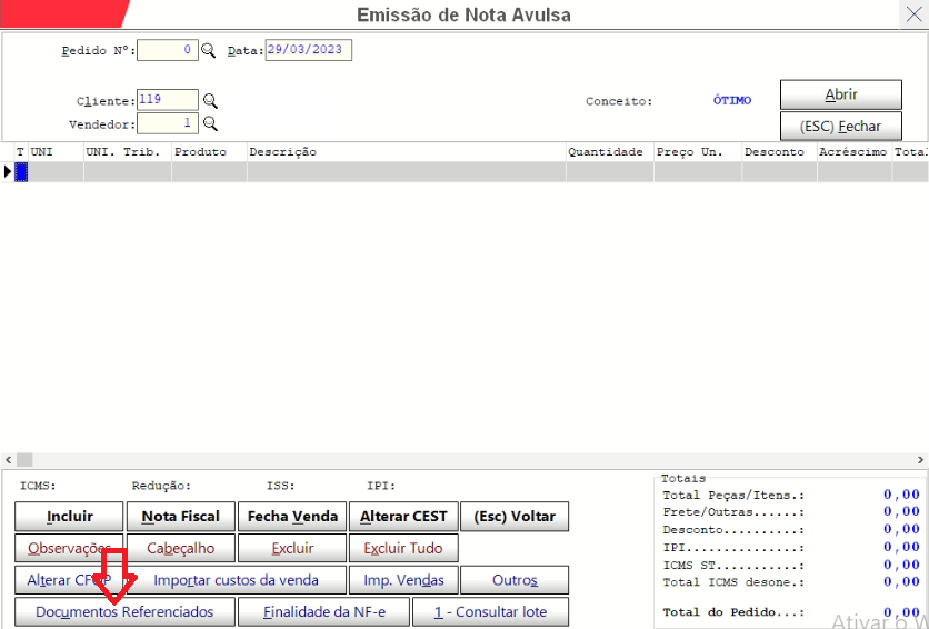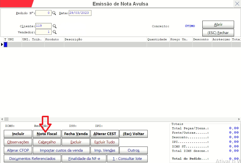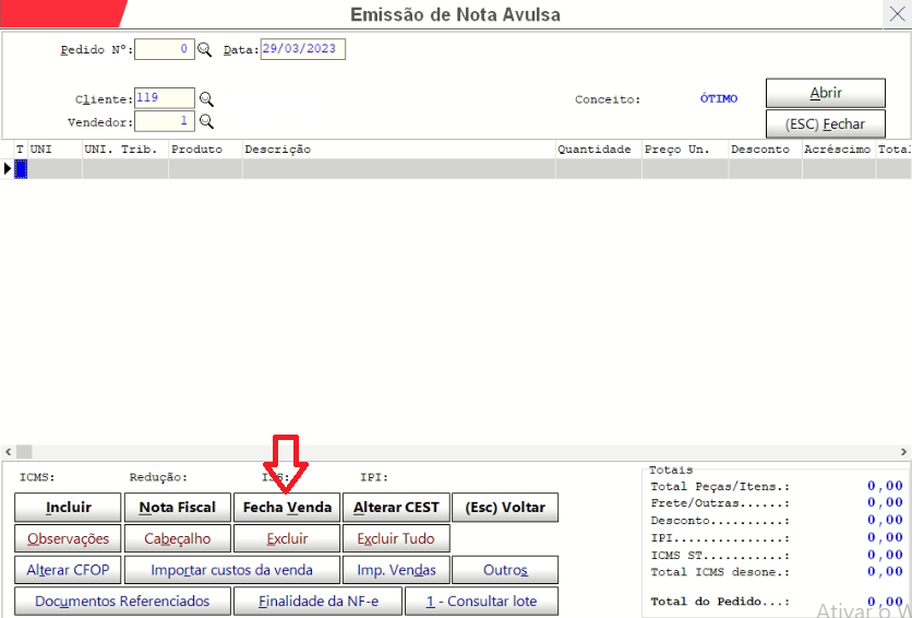 >Após emissão da nota fiscal, voltar a para tela de nota avulsa e clicar em Fecha Venda: