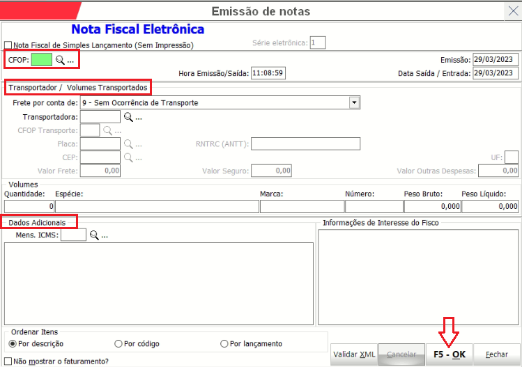 > Informe o cfop da Natureza da Operação e se haverá frete ou alguma informação adicional. Após a conferência das informações, clicar em OK: