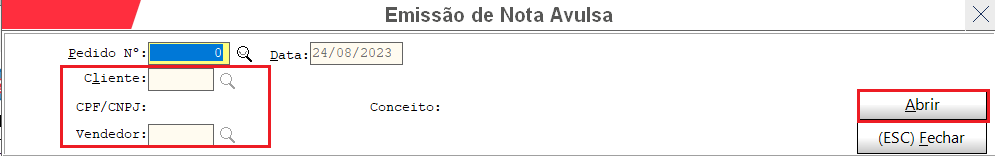 Irá abrir esta tela e é só apertar enter que irá pular de campo pedido para data e depois para campo cliente. Informe o Cliente e Vendedor.