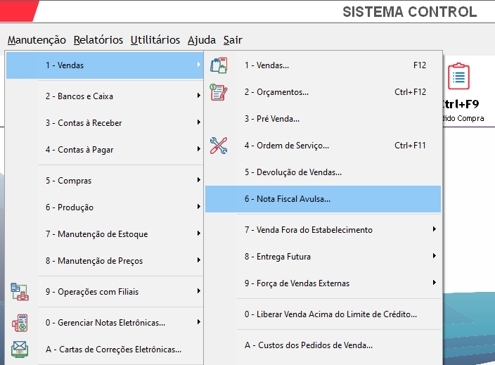 Após confirmar o lançamento da nota referenciada, feche essa tela e volte para a tela principal. Clique em Nota Fiscal: