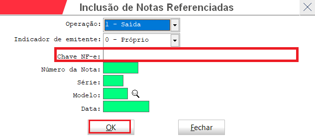 Quando digitar a chave da nota que está sendo estornada e apertar ENTER, os campos em verde serão preenchidos automaticamente. Confira as informações e clique em Ok