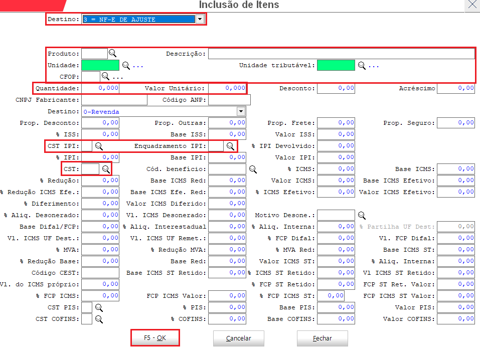 - Destino: 3= NFe de Ajuste