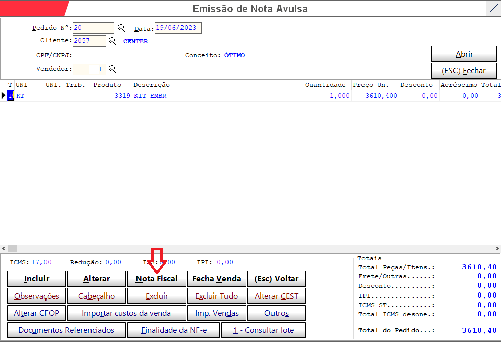 Obs: no campo cliente, cadastre o destinatário como cliente para poder emitir nota avulsa.